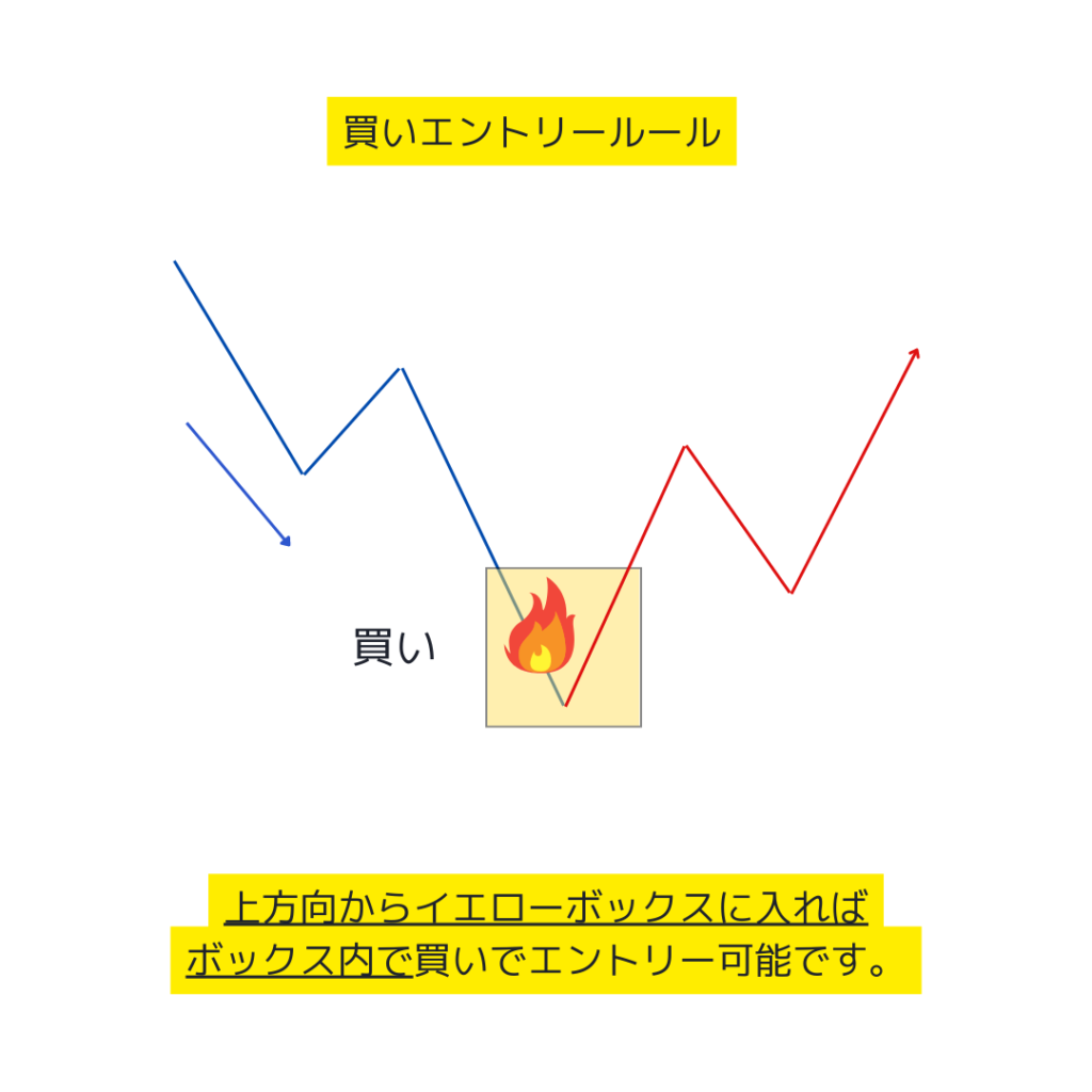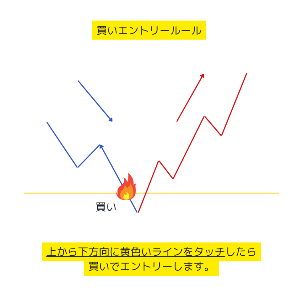 上から下方向に黄色いラインをタッチしたら「買い」でエントリーする。